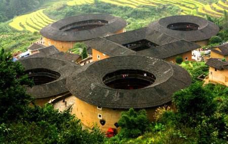 福建南靖县拥有各类土楼一万五千多座,堪称“土楼王国”,汇集了最高、最大、最小、最奇、最古老、最壮观的土楼。成千上万的土楼像“天上掉下的飞碟”、“地上长出的蘑菇”,点缀在南靖美丽的大地上,形成一道美妙绝伦的风景线,被誉为“世界上独一无二神话般的山村建筑模式”。
