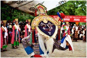 藏戏是带着面具、以歌舞演故事的藏族戏剧,形成于14世纪,流传于青藏高原。常演剧目为八大传统藏戏,内容大都是佛经中劝善惩恶的神话传说。藏戏原来流传于民间,由艺人口传心授在广场或寺院中演出,后来建立了专业剧团,出现了舞台演出形式,这两种演出样式都为藏族群众认可和喜爱。藏戏承载着藏族文化的血脉,反映了藏族人民的生活面貌和思想感情,是他们文化生活的重要组成部分。