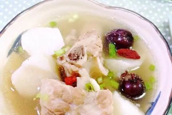 做法:排骨剁小块洗净,山药去皮切滚刀块,排骨和山药分别飞水捞出备用;锅中放清水烧开后放入排骨、葱段、姜片、绍酒,煮30分钟加入山药、小枣、盐、鸡精、调味再煮十分钟出锅前放入枸杞即可。 功效:健脾醒胃、去湿、抗疲劳 春分时人体易发常见的非感染性疾病有 高血压、月经失调、痔疮及过敏性疾病等 故此时饮食需保持寒热均衡 并不适饮用过于肥腻的汤品