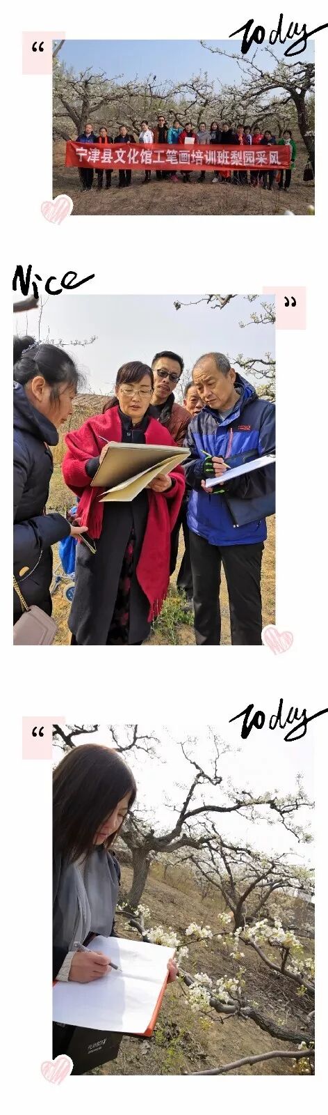 3月29日,阳光明媚,春风暖意,宁津县文化馆把工笔画培训班搬到西雒村梨园现场采风授课,通过现场采风让学员们亲眼目睹盛开的梨花,观察梨花的造型、生长规律!面对盛开的梨花,学员们热情高涨,都纷纷拿出画本,画出他们心中的梨花!